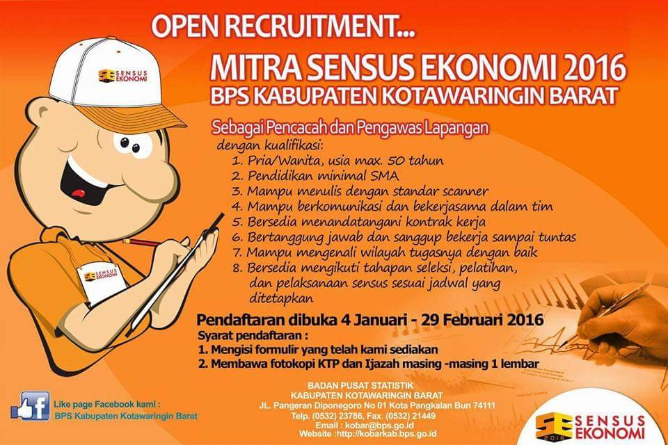 BPS Kab KOBAR Mitra Sensus Ekonomi 2016 (Exp Date 29 Feb 2016) Posted by Arif Adiguna Categories LokerBUMD Date 13 January 2016 Comments 0 comment Dalam rangka Sensus Ekonomi 2016, BPS Kab Kotawaringin Barat membutuhkan Tenaga Petugas Lapangan, Keterangan selanjutnya pada gambar sebagai berikut : Tag:Loker, lokerbumd Share: Arif Adiguna Admin Web Poltekkes Previous post BPS Kab KOTIM Membutuhkan Calon Petugas Lapangan (Exp Date 14 Feb 2016) 13 January 2016 Next post BPS Kab Sukamara Mitra Petugas Lapangan (Exp Date Daftar Secepatnya saja) 13 January 2016 You may also like Penerimaan Pegawai Tidak Tetap (PTT) di lingkungan Pemerintahan Kab. Gunung Mas (415 orang) Tenaga Kesehatan, Teknis/Administrasi dan Guru (Exp 3-6 Feb 2016) 3 February, 2016 CSR Telkom - Kuala Kapuas (Exp Date 25 Jan 2016) 23 January, 2016 CSR Telkom - Palangka Raya (Exp Date 10 Feb 2016) 21 January, 2016