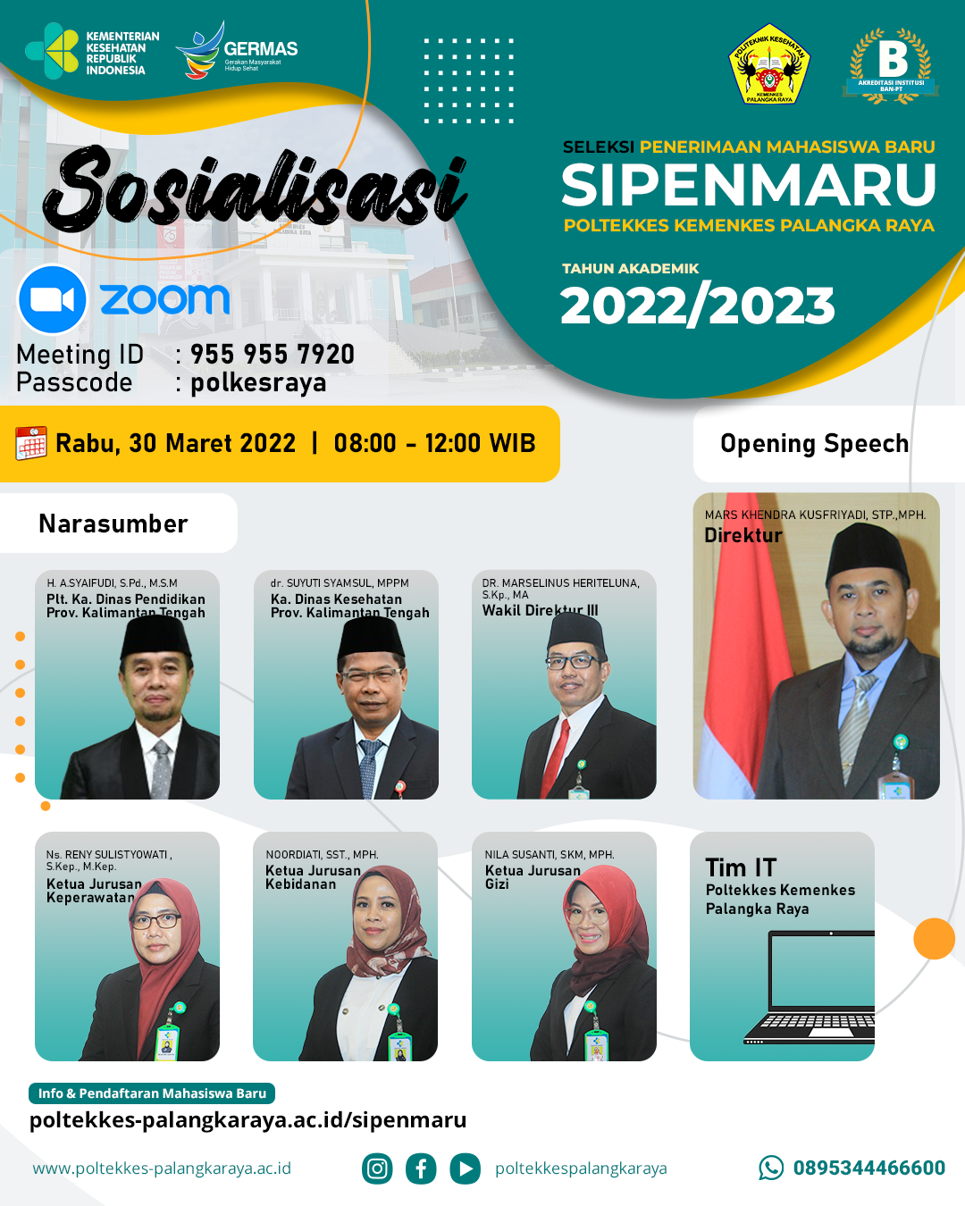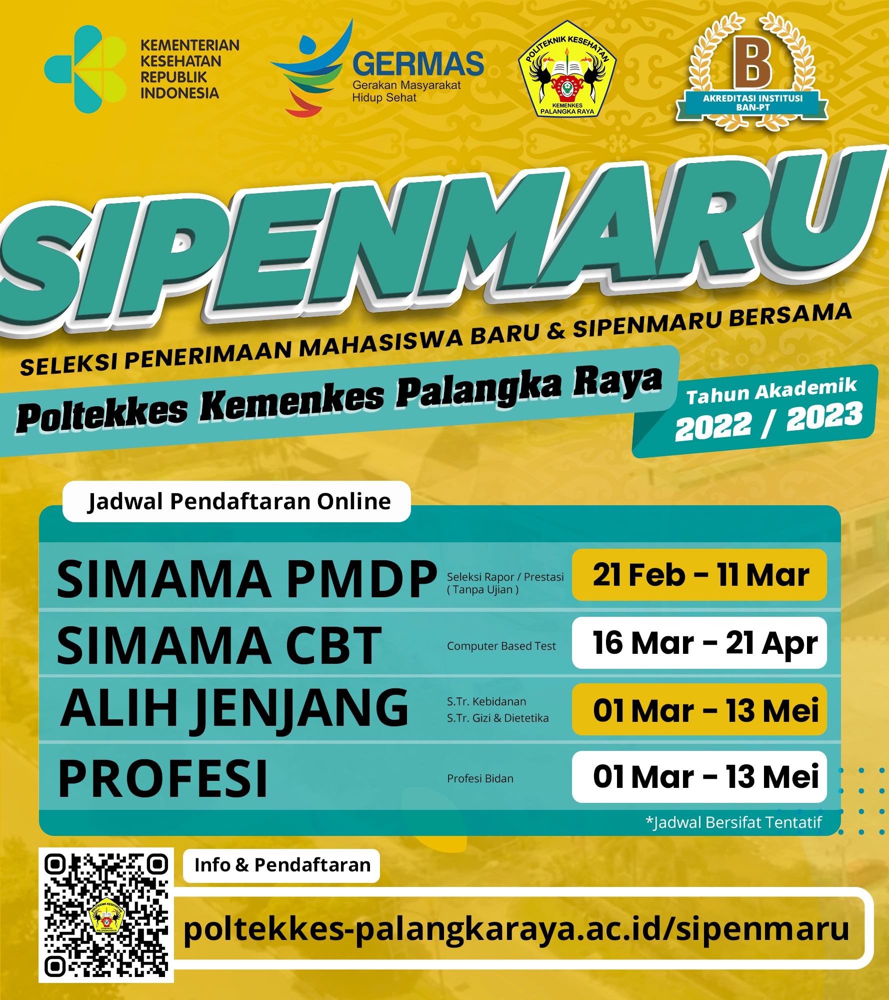 Poltekkes Kemenkes Palangka Raya Menyelenggarakan Sosialisasi Seleksi Penerimaan Mahasiswa Baru (SIPENMARU) Tahun Akademik 2022/2023 Mengundang : Kepala SMA dan SMK Prov. Kalimantan Tengah, Rekan-Rekan Calon Mahasiswa(i) Hari, Tanggal : Rabu, 30 Maret 2022 Waktu : …
