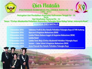 Peringatan hari pendidikan kesehatan kalimantan tengah ke 50 dan dies natalis ke 15 poltekkes kemenkes palangkaraya dengan tema Citivitas Akademika Poltekkes Kemenkes Palangkaraya Hidup Sehat,Indonesia Kuat.yang akan dilaksanakan pada hari senin,07 November 2016 s/d 12 …