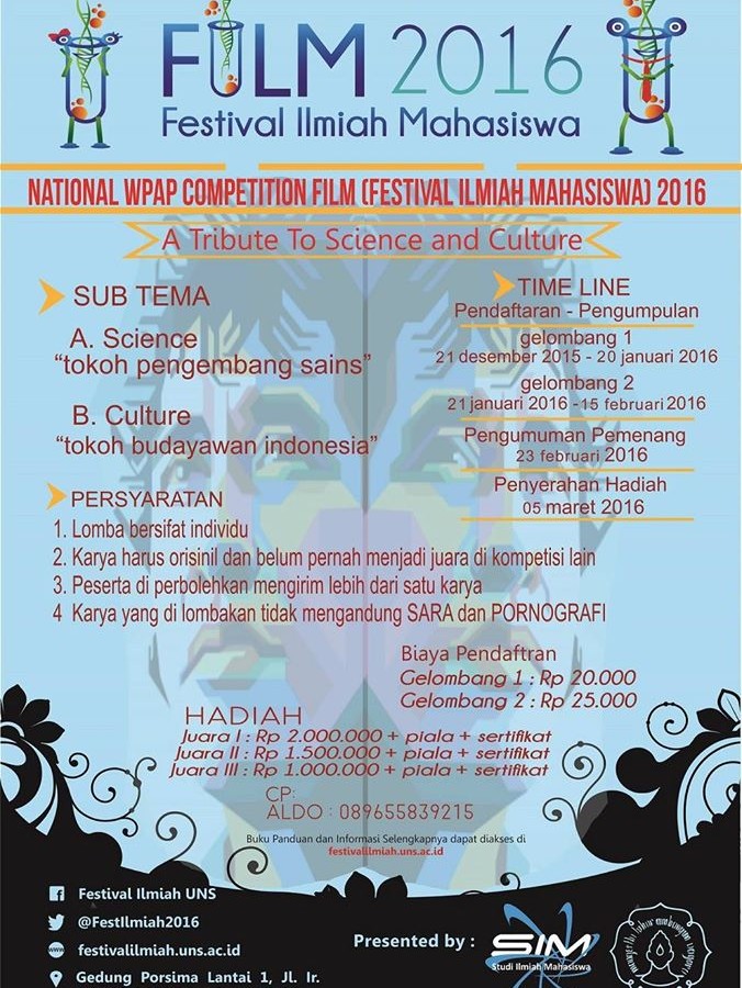 Lomba WPAP merupakan salah satu rangkaian acara dalam kegiatan Festival Ilmiah Mahasiswa (FILM) 2016 yang diselenggarakan oleh Studi Ilmiah Mahasiswa UNS. Lomba ini merupakan sebuah kompetisi yang ditujukan kepada mahasiswa D3/S1 seluruh perguruan tinggi baik PTN maupun PTS di Indonesia. Lomba ini bersifat individu. Karya harus orisinil dan belum pernah menjadi juara di kompetisi yang sama. Peserta diperbolehkan mengirim lebih dari satu karya. Karya yang dilombakan tidak mengandung SARA dan pornografi. Bagi Anda yang ingin berpartisipasi dalam acara ini, silakan melakukan pendaftaran dengan membayar biaya registrasi sebesar Rp 20.000 (Gelombang I) atau Rp 25.000 (Gelombang II) kemudian mengupload karya Anda pada www.festivalilmiah.uns.ac.id. Peserta diwajibkan menyertakan Judul dan Konsep karya guna mendukung penjelasan dari karya yang dikirimkan