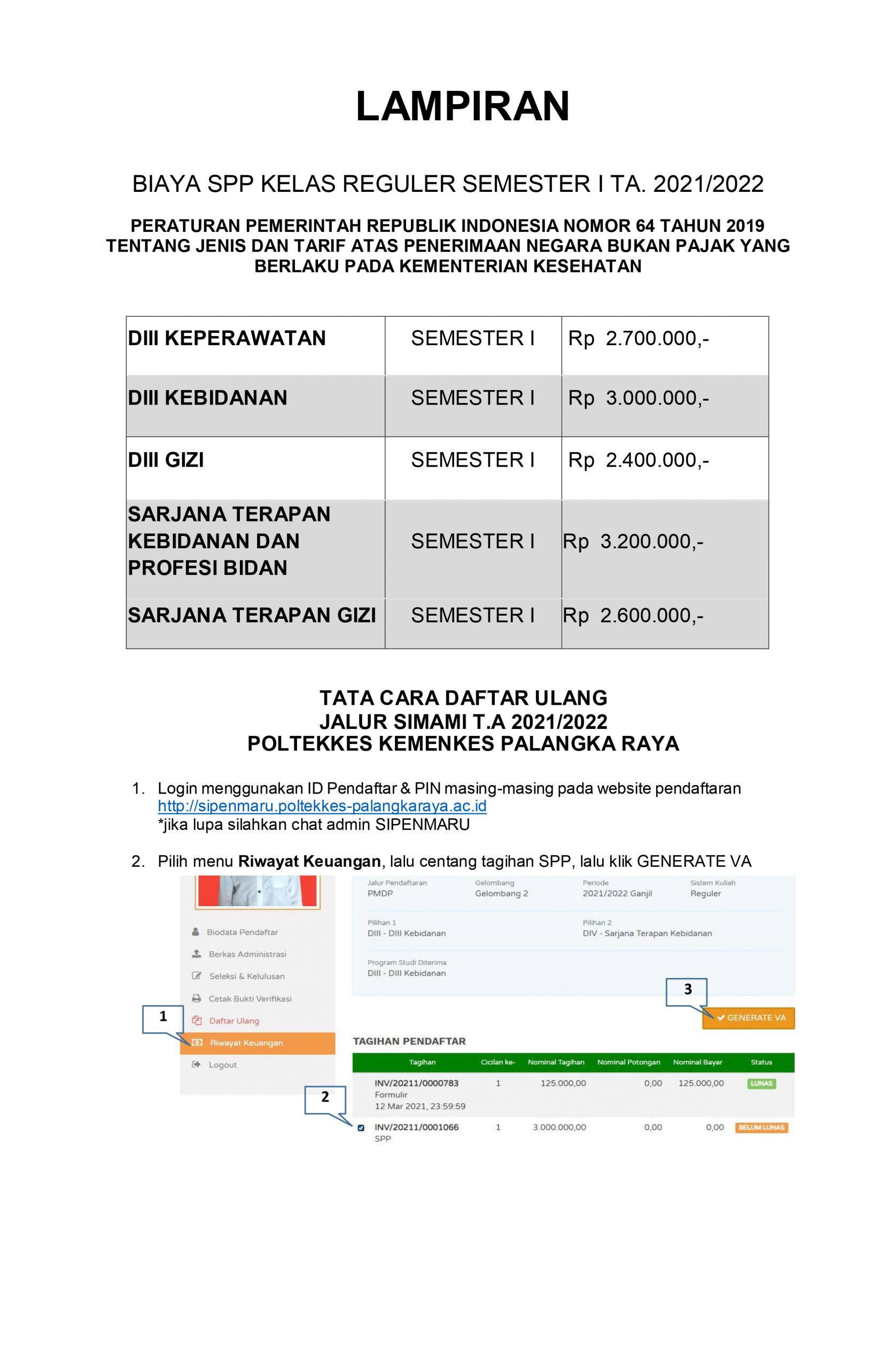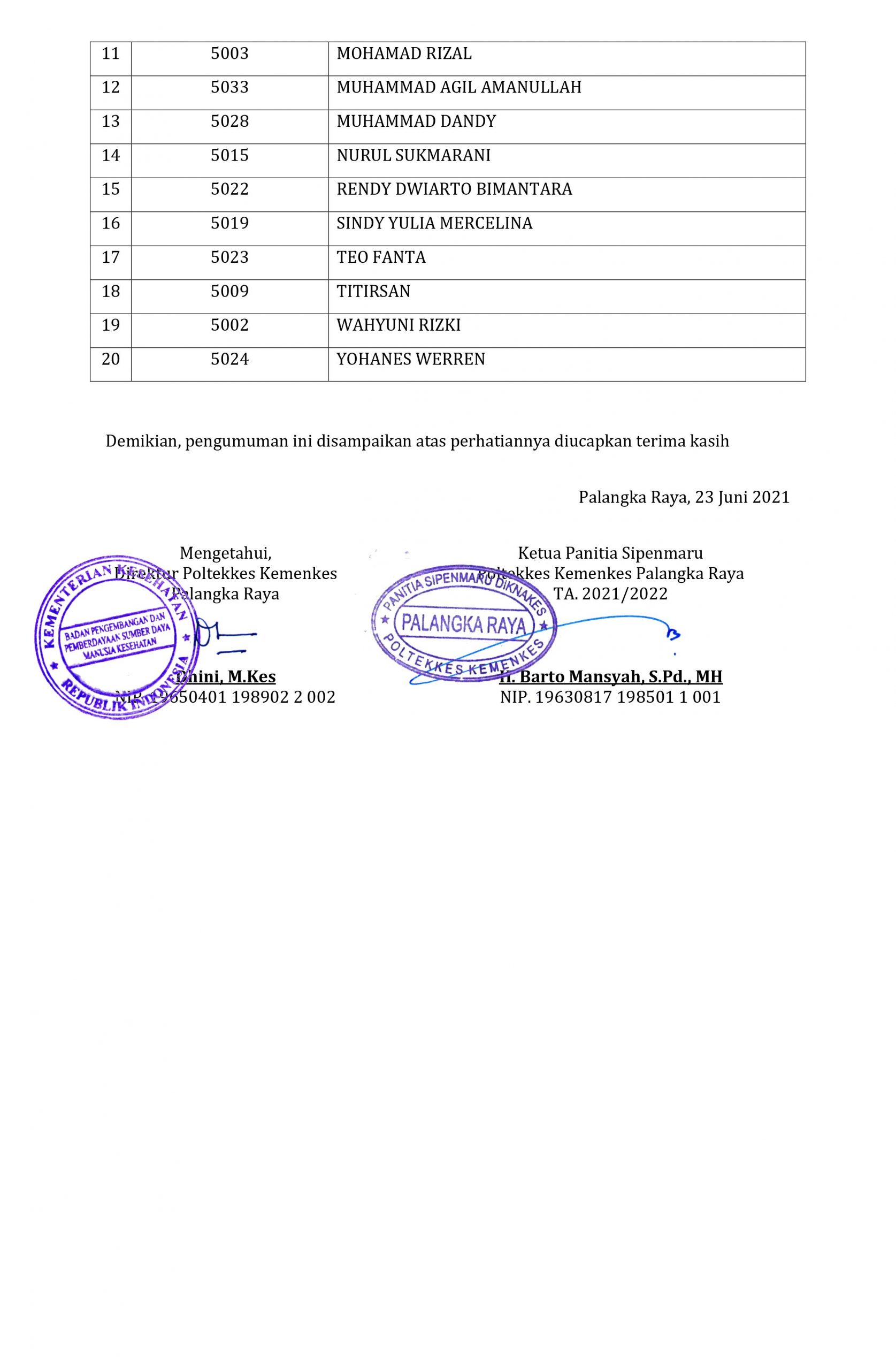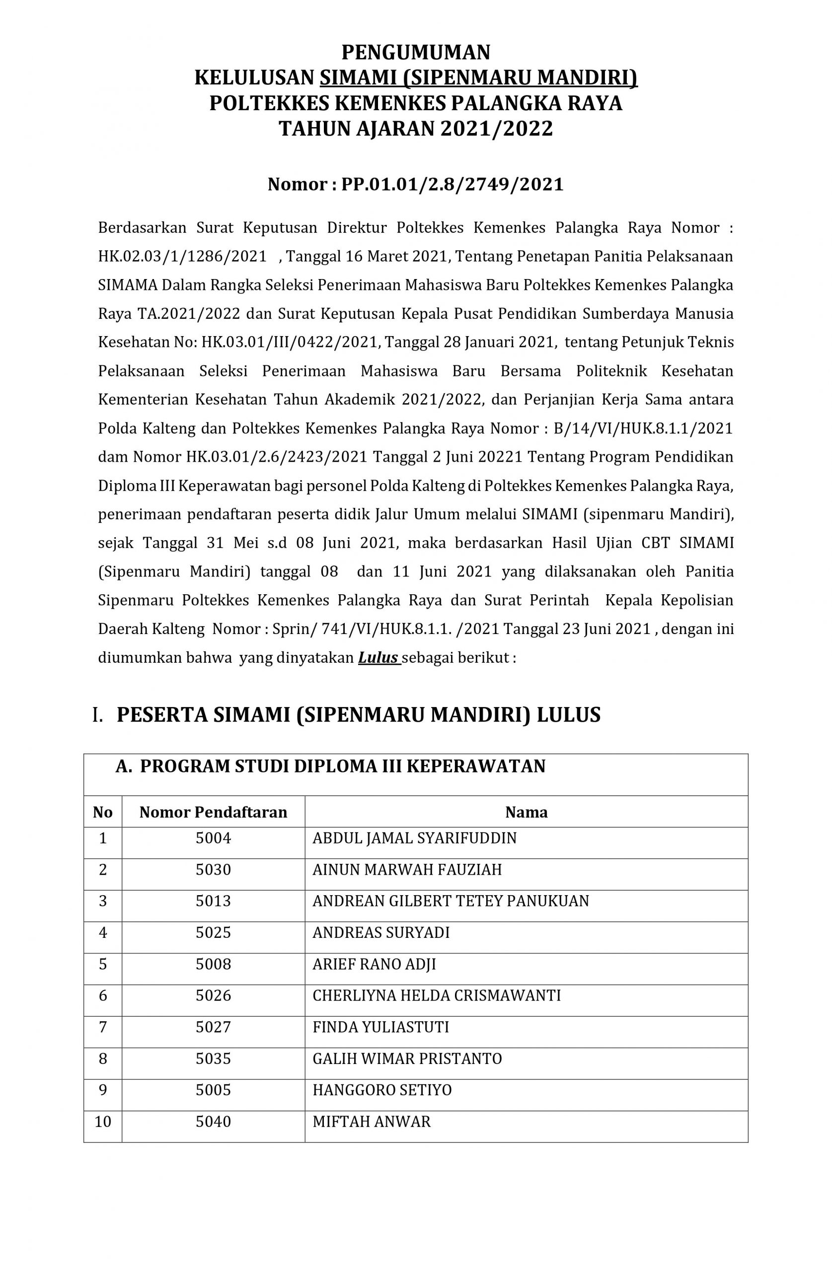 PENGUMUMAN KELULUSAN SIMAMI (SIPENMARU MANDIRI) KHUSUS ANGGOTA POLRI - POLTEKKES KEMENKES PALANGKA RAYA TAHUN AJARAN 2021/2022 Posted by Arif Adiguna Categories Pengumuman, Sipenmaru Date 23 June 2021 47,040 total views, 8 views today Share: Arif Adiguna Admin Web Poltekkes Previous post PENGUMUMAN AKHIR HASIL TES KESEHATAN LULUS CADANGAN (4) SIMAMA POLTEKKES KEMENKES PALANGKA RAYA TAHUN 2021 23 June 2021 Next post PENGUMUMAN HASIL SELEKSI SIPENMARU PENDIDIKAN PROFESI BIDAN POLTEKKES KEMENKES PALANGKA RAYA TAHUN AJARAN 2021/2022 7 July 2021 You may also like Pelaksanaan Pembelajaran Semester Genap T.A. 2021/2022 Poltekkes Kemenkes Palangka Raya 5 January, 2022 7,226 total views, 193 views today Pengumuman Jadwal Pembayaran SPP Semester Genap T.A. 2021/2022 30 December, 2021 8,810 total views, 197 views today Pengumuman Jadwal Pembayaran SPP Semester Ganjil T.A. 2021/2022 8 July, 2021 55,359 total views, 139 views today