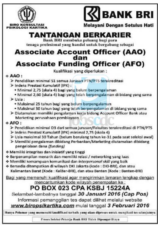 PT. Bank Rakyat Indonesia (Persero) Tbk - D3, S1 Fresh Graduate (Exp. Date 30 Januari 2016) Posted by Bagus Indriatmojo Categories Loker BUMN Date 15 January 2016 Comments 0 comment Associate Account Officer (AAO) dan Associate Funding Officer (AFO), penempatan BRI Jakarta, Banten dan Kalbar.. Selengkapnya dapat dilihat pada gambar berikut : Tag:bank, bumn, Loker, Lowongan Share: Bagus Indriatmojo Admin Web Poltekkes Previous post BPS Kab. Lamandau Mitra Sensus Ekonomi 2016 (Exp. Date 19 Februari 2016) 15 January 2016 Next post PORNIMAKES POLTEKKES KEMENKES REGIONAL KALIMANTAN DI PALANGKA RAYA 15 January 2016 You may also like Asisten Frontliner (Teller) BNI - Min D3 Semua Jurusan (Exp Date : 8 Juni) 25 May, 2016 Penerimaan Pegawai (Tahap I) BPJS Kesehatan Tahun 2016 (Exp Date : 18 Mei) 14 May, 2016 Penerimaan Pegawai Reguler (berbagai posisi) - BPJS Ketenagakerjaan (Exp Date : 9 April) 4 April, 2016