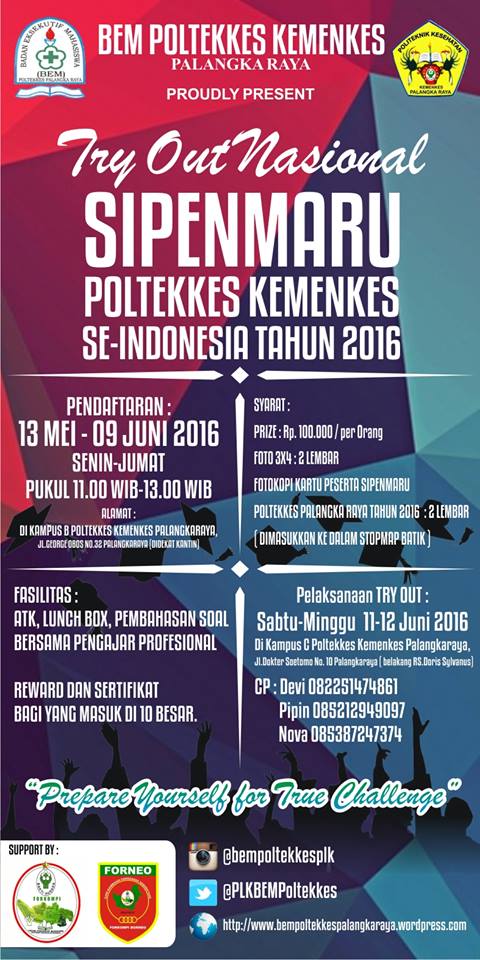 Ayo!!! Daftarkan dirimu dan ajak teman-temanmu untuk mengikuti Try Out Sipenmaru Nasional 2016 hanya dengan membayar Rp.100.000,-!!! Murah sekali bukan??? Tunggu apa lagi langsung saja mendaftar dikampus B Poltekkes dijalan G.Obos No.32, tepatnya di dekat Kantin.